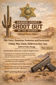 Graham County Shoot Out When May 22, 2026 9:00 am - 1:00 pm Add To Calendar Download ICS Google Calendar iCalendar Office 365 Outlook Live Where Safford Police Range Event Type Training Map Unavailable The waiver can be accessed here